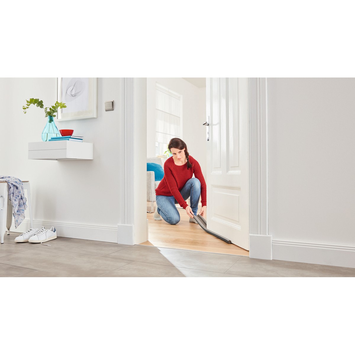Der tesa® Zugluftstopper eignet sich für glatte Böden wie Parkett oder Laminat und ist eine einfache wie effektive Methode, um Türen schnell und sauber gegenüber Zugluft und auch Lärm abzudichten. Die Montage des Zugluftstoppers ist kinderleicht und lässt sich in nur 30 Sekunden bewerkstelligen. Außer einem scharfen Teppichmesser benötigen Sie kein Werkzeug. Tür ausmessen, Zugluftstopper kürzen und unter das Türblatt schieben … fertig. Die Doppel-Dichtung schützt zuverlässig vor kalter Luft, Schmutz oder Lärm und ist deutlich effizienter als ein Türvorleger. Auf lange Sicht können Sie mit dieser innovativen Lösung einen beträchtlichen Teil Ihrer Energiekosten einsparen. Geringer Aufwand, große Wirkung!
