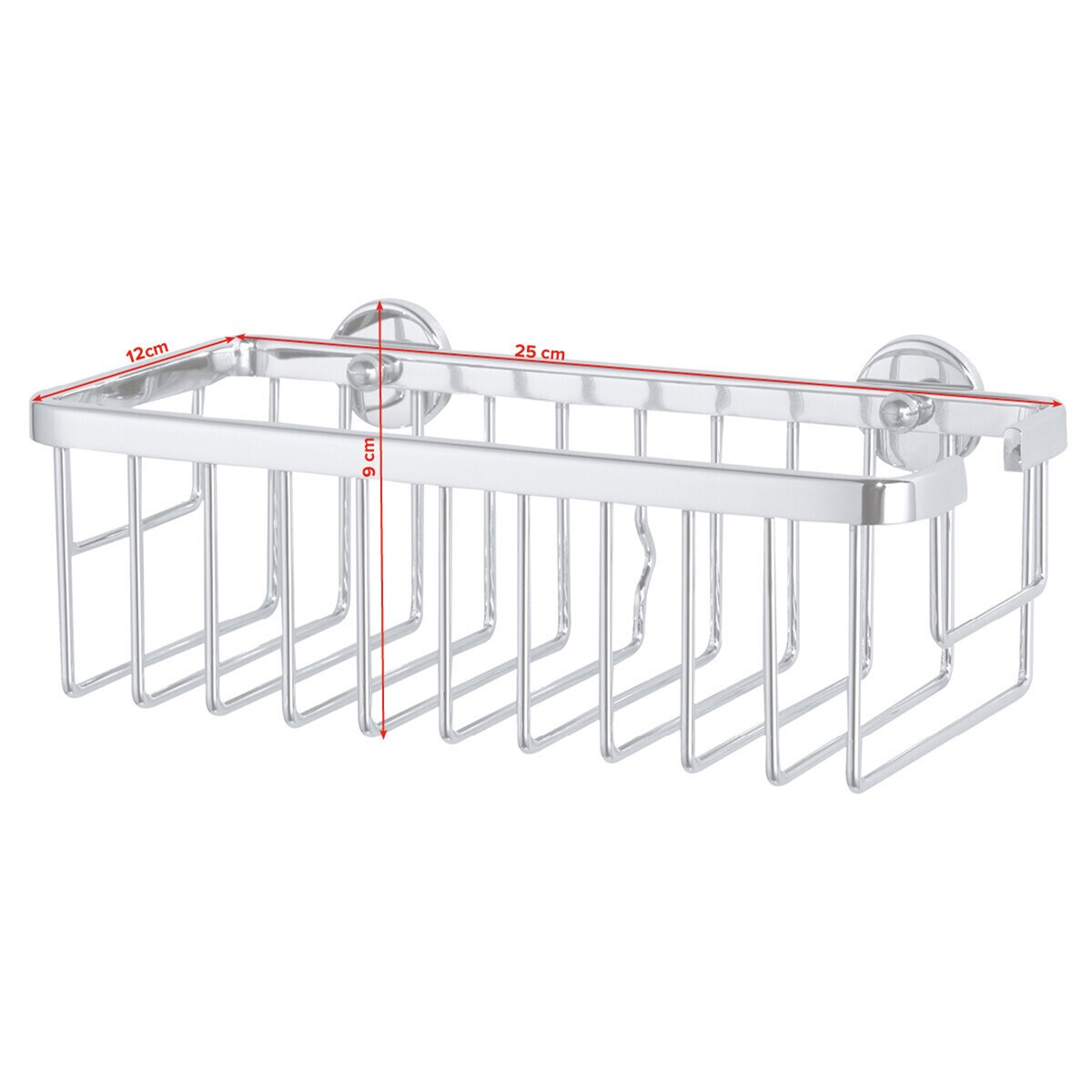 • Aluminium, verchromt, garantiert rostfrei, wasserbeständig, runde Wandplatten, rechteckige Ablage, abgerundete Ränder und Streben, extra tiefer Boden