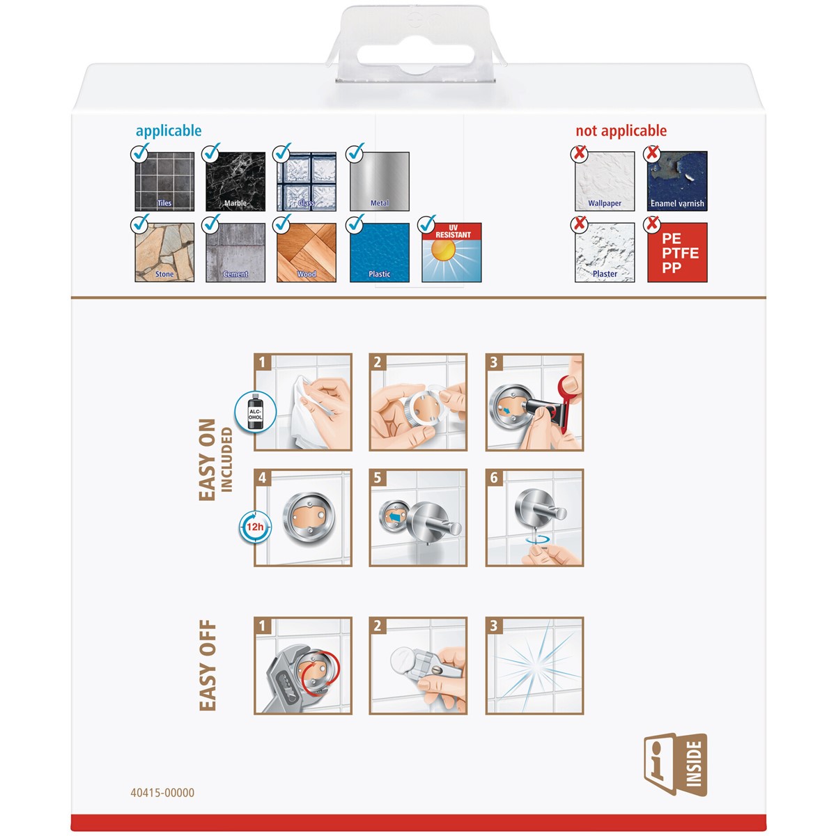 • Hält auf Fliesen, Metall, Naturstein, Marmor, Glas, Holz und vielen Kunststoffen