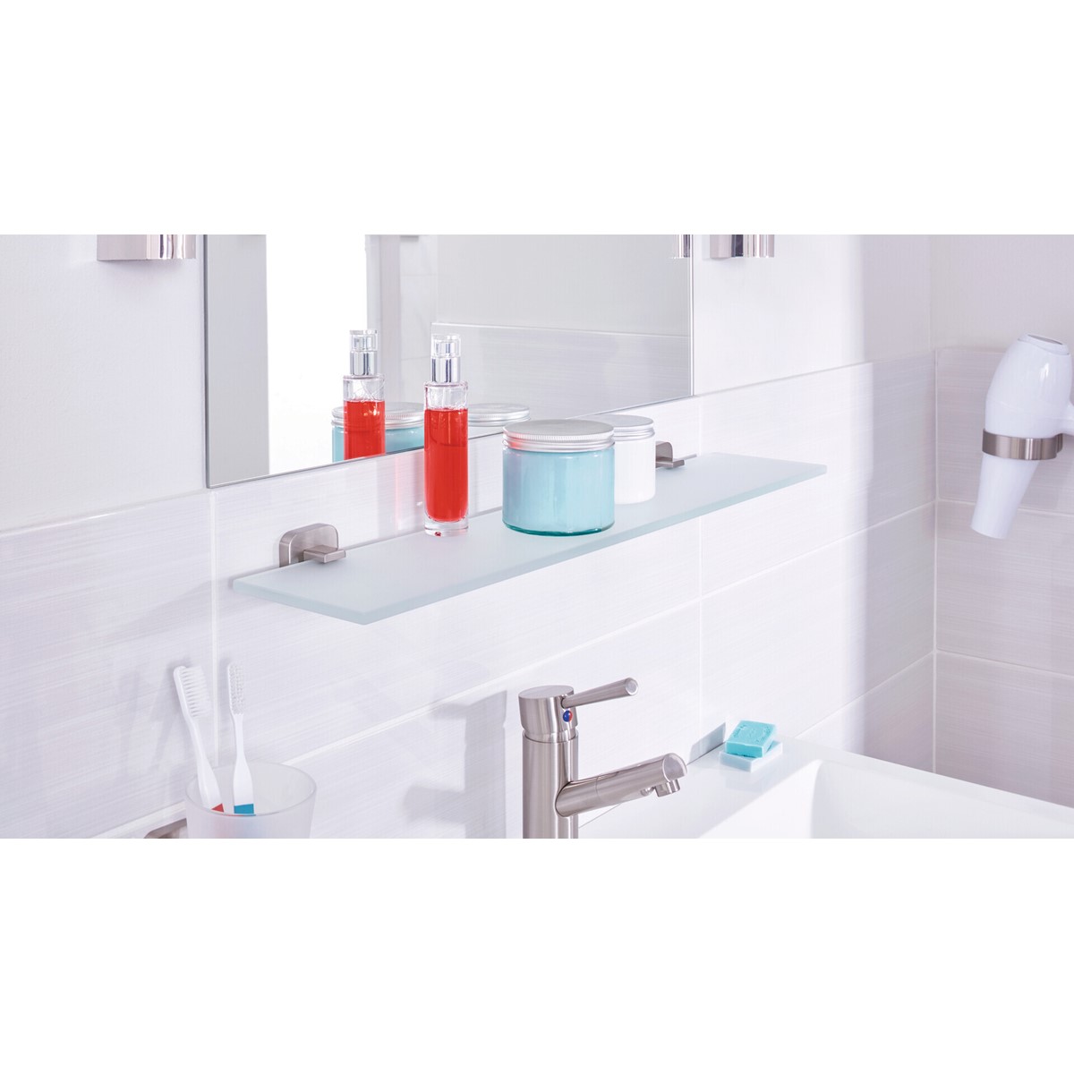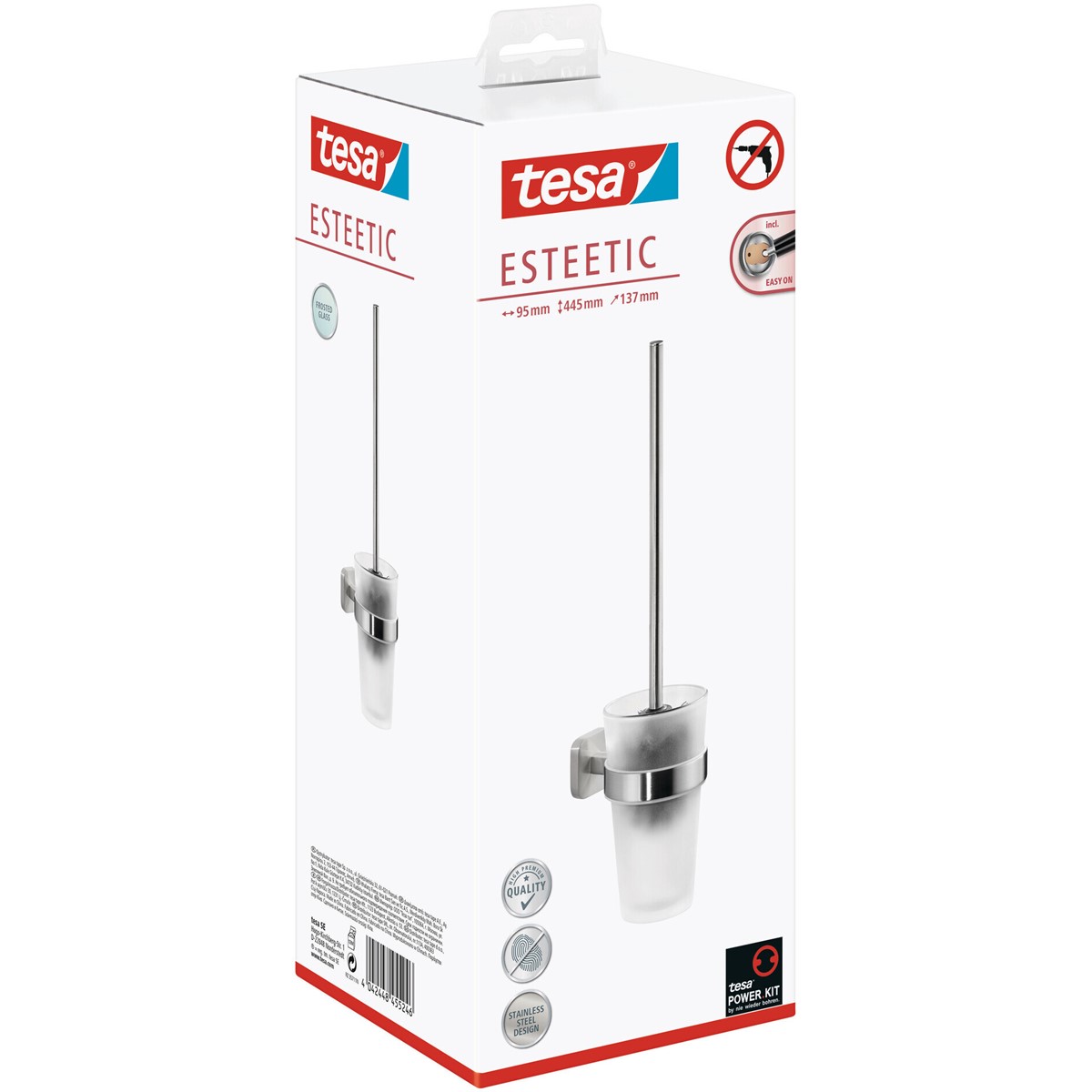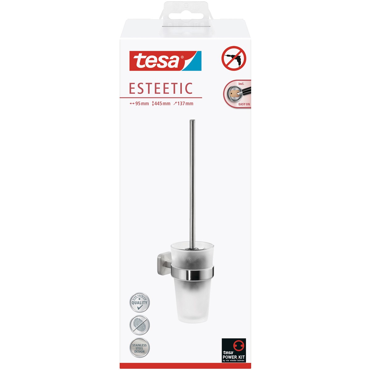 Die Wandmontage des tesa® ESTEETIC Toilettenbürstenhalters ist sehr einfach. Dabei kommen Sie ohne Bohren aus und vermeiden Schäden am Untergrund. Nachdem Sie den Befestigungsadapter angebracht und mit der Klebmasse gefüllt haben, warten Sie 12 Stunden und können die Toilettenbürste anbringen. Trotz der hohen Haltekraft können Sie sie jederzeit entfernen und mit einem neuen Adapter (BK20) wiederverwenden. Auch optisch beeindruckt die WC-Bürstengarnitur. Besonders das Zusammenspiel aus kühler Edelstahloptik und dem Milchglas sticht heraus. tesa.Power.Kit Glue: Achtung! Bei der Verwendung kann gefährlicher lungengängiger Staub entstehen. Staub nicht einatmen.