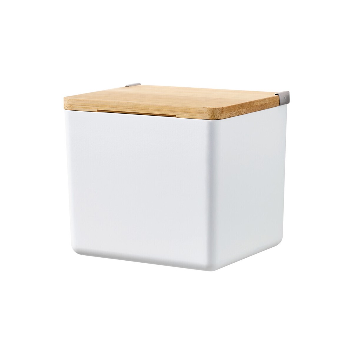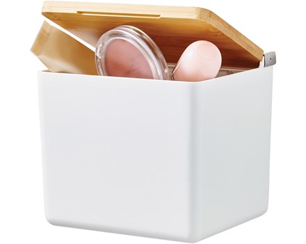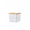 Hochwertige, mattweiße und modern gestaltet Kunststoffbox mit Deckel aus Bambus