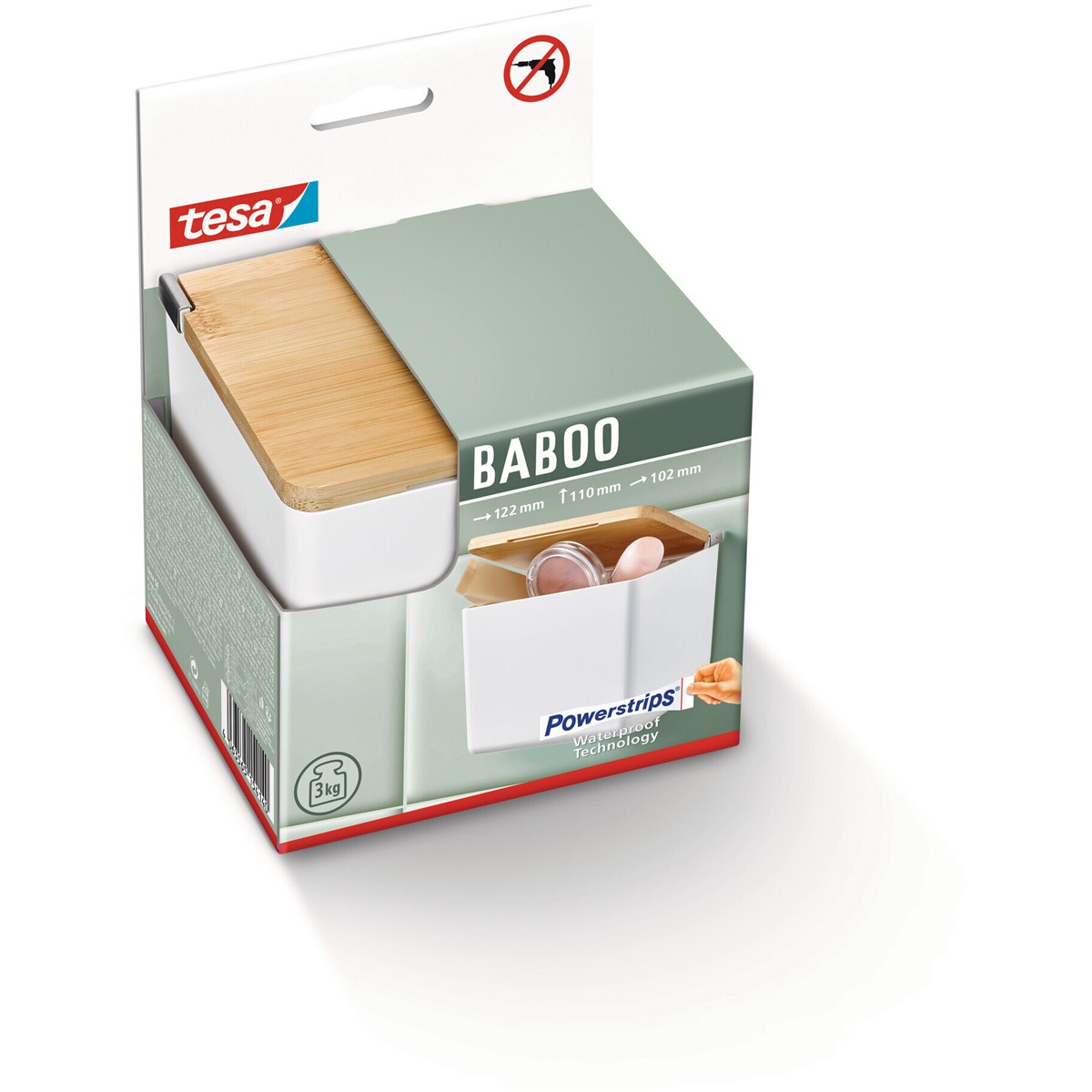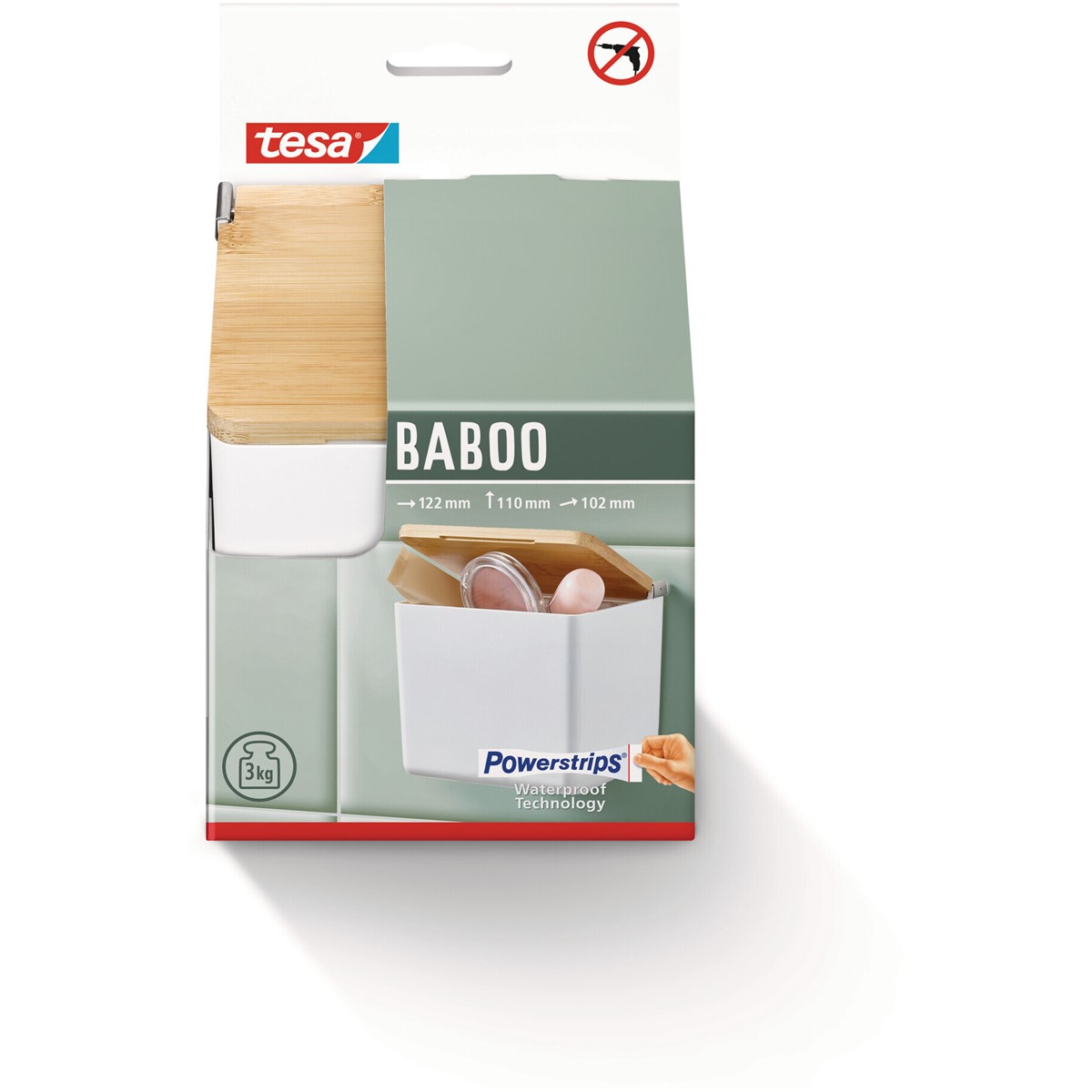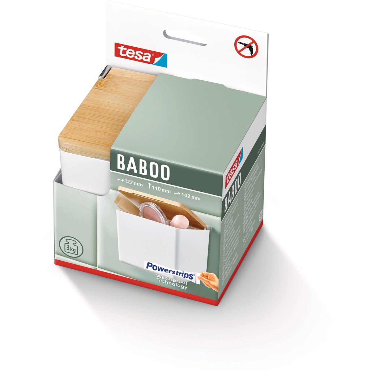 Mit der kleinen tesa® Baboo Aufbewahrungsbox, die jedes Bad auch optisch aufwertet, sorgen Sie für zusätzlichen Stauraum in Ihrem Badezimmer. Die hochwertige weiße Kunststoffbox mit Bambusdeckel eignet sich perfekt, um insbesondere in kleineren Räumen Kosmetika und andere Badutensilien übersichtlich und platzsparend aufzubewahren. Mit der tesa® Powerstrips Waterproof Befestigungstechnologie, die über einen starken Halt bis zu 3 kg verfügt, lässt sich die Box einfach und ohne Bohren oder zusätzliches Werkzeug sicher an der Oberfläche befestigen. An der Wand entstehen dabei keine Schäden. Die Aufbewahrungsbox kann bei Bedarf spurlos wieder entfernt werden. Mit neuen tesa® Powerstrips Waterproof Klebestreifen ist eine erneute Befestigung der Box problemlos möglich.