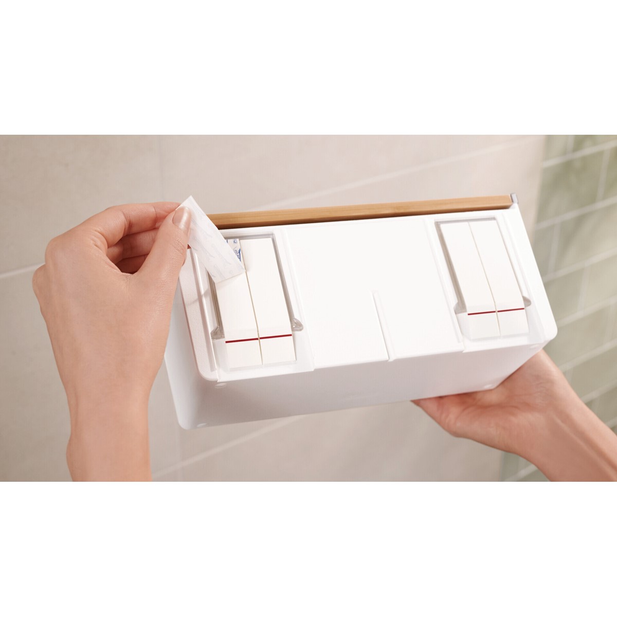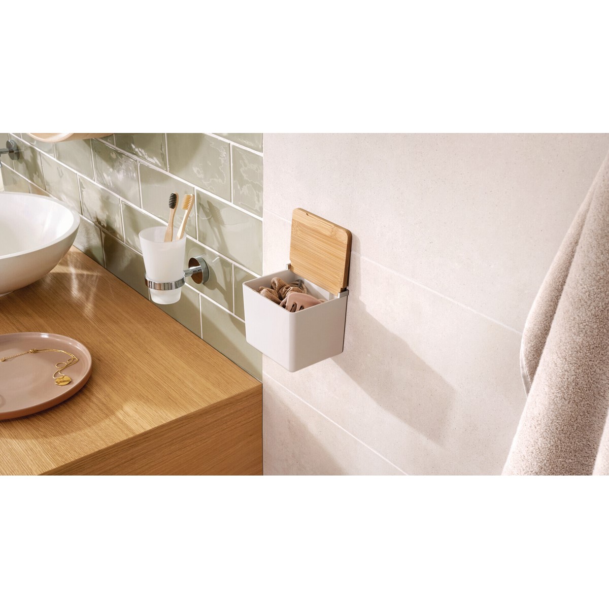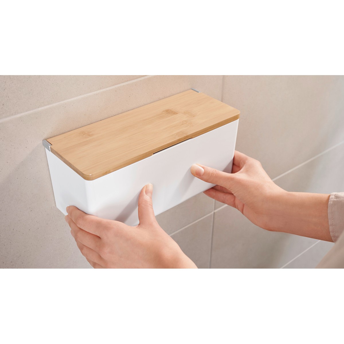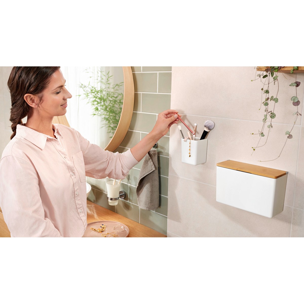 Mit der kleinen tesa® Baboo Aufbewahrungsbox, die jedes Bad auch optisch aufwertet, sorgen Sie für zusätzlichen Stauraum in Ihrem Badezimmer. Die hochwertige weiße Kunststoffbox mit Bambusdeckel eignet sich perfekt, um insbesondere in kleineren Räumen Kosmetika und andere Badutensilien übersichtlich und platzsparend aufzubewahren. Mit der tesa® Powerstrips Waterproof Befestigungstechnologie, die über einen starken Halt bis zu 3 kg verfügt, lässt sich die Box einfach und ohne Bohren oder zusätzliches Werkzeug sicher an der Oberfläche befestigen. An der Wand entstehen dabei keine Schäden. Die Aufbewahrungsbox kann bei Bedarf spurlos wieder entfernt werden. Mit neuen tesa® Powerstrips Waterproof Klebestreifen ist eine erneute Befestigung der Box problemlos möglich.