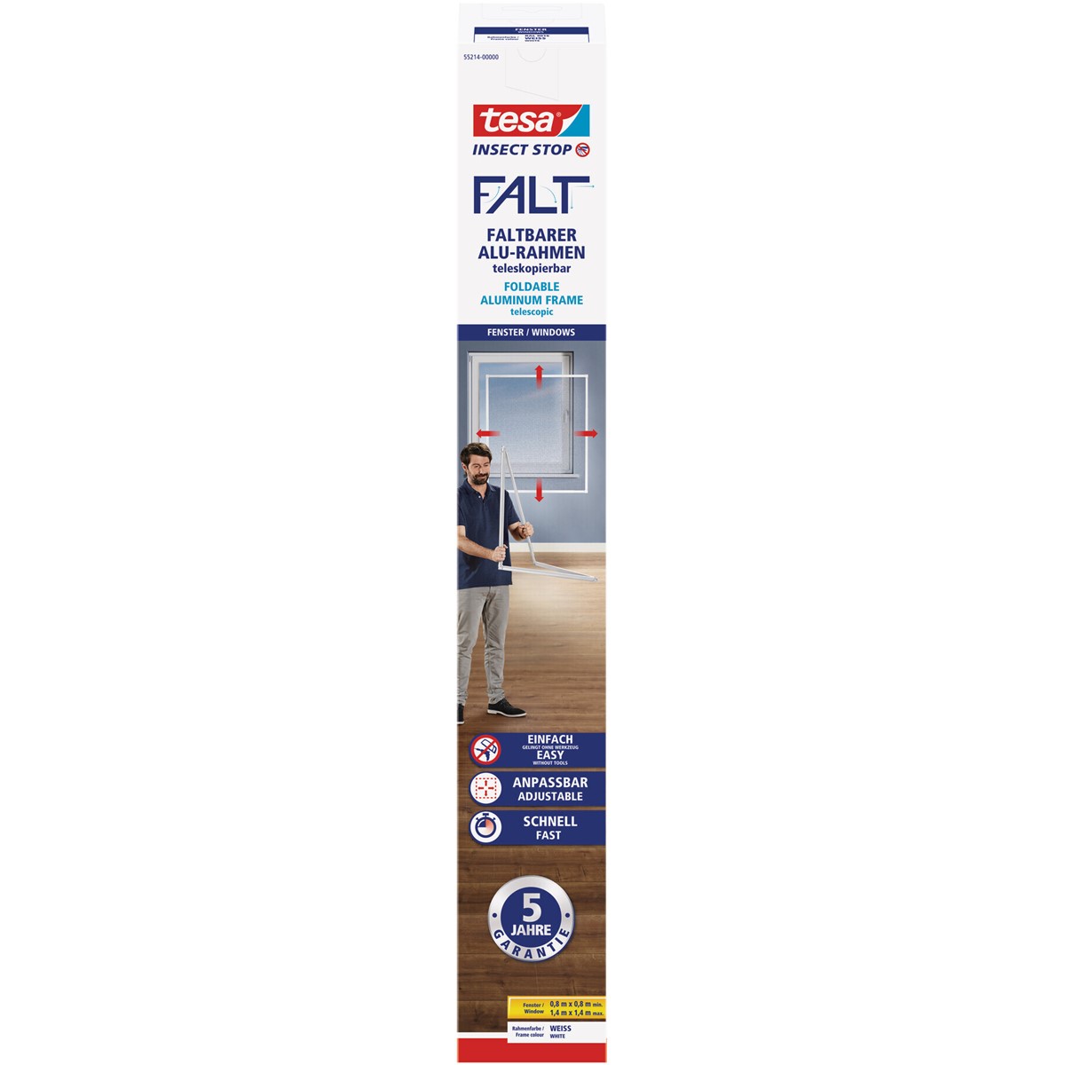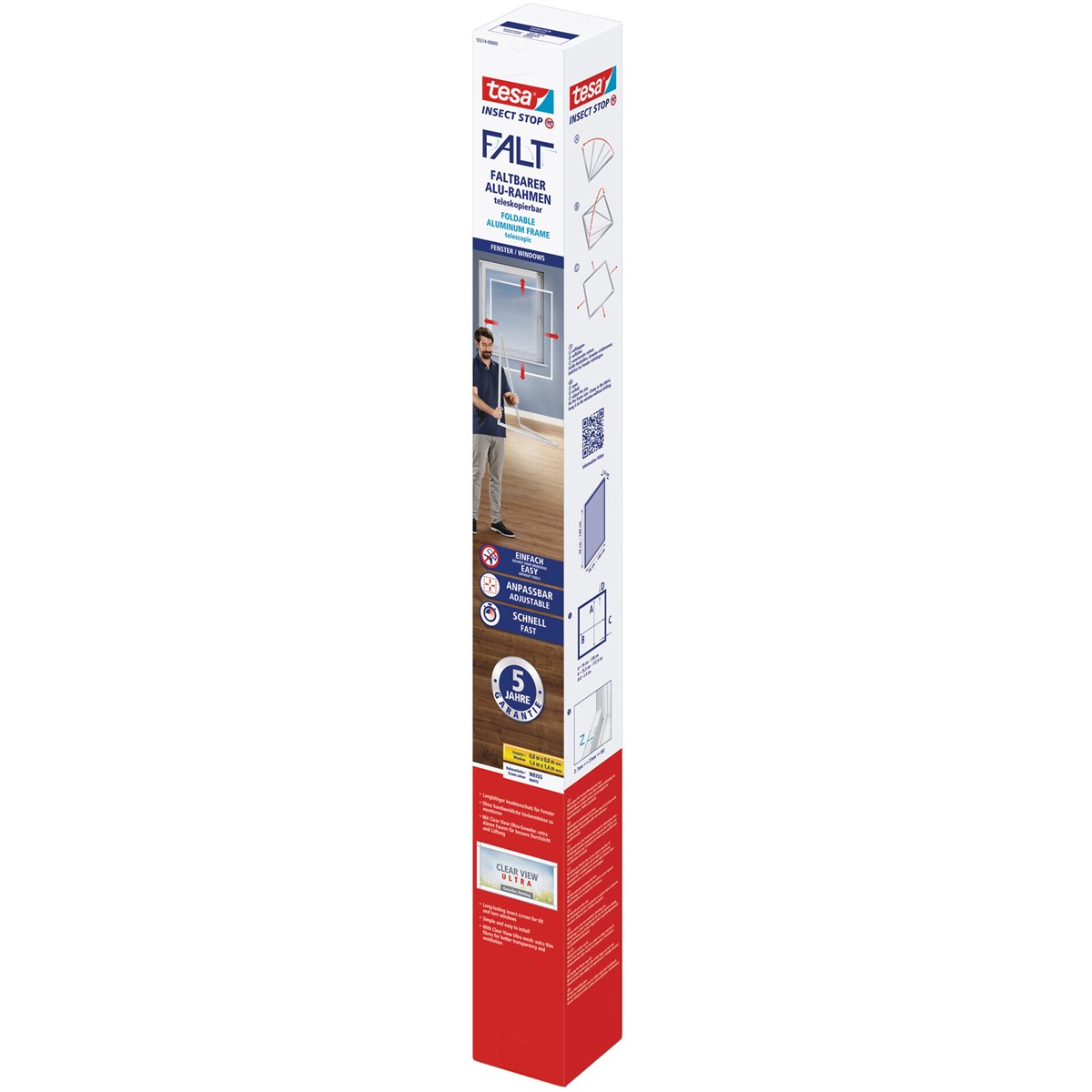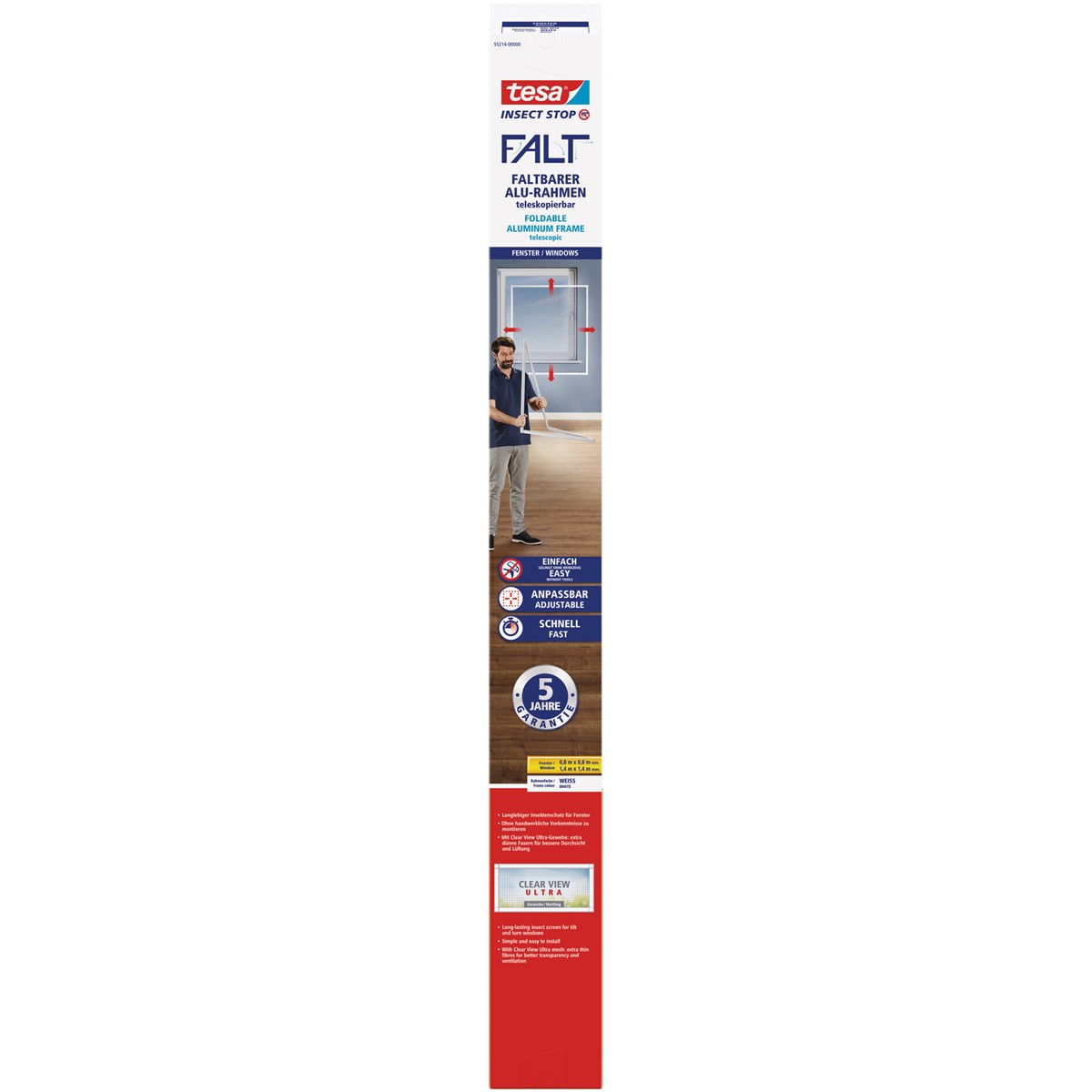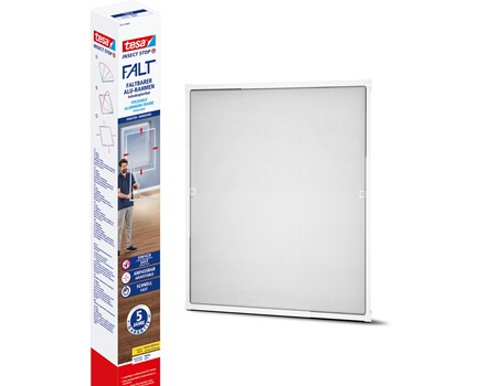 tesa® Insect Stop FALT - faltbarer Alu-Rahmen, teleskopierbar ist die langfristige Lösung, wenn es um Insektenschutz geht. Er ist das am einfachsten zu montierende und zudem frei einstellbare tesa® Fliegengitter für Fenster. Deshalb wird außer einer Schere für die Montage nichts benötigt. Nur vier Montage-Schritte für das Fliegengitter ohne Bohren: