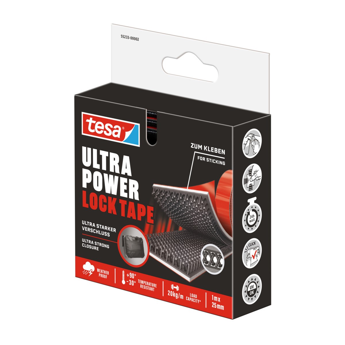 Das tesa® Ultra Power Lock Tape ist eine robuste Alternative zu herkömmlichen Klettbändern und eignet sich ideal für Heimwerker, die schwere Gegenstände im Innen- und Außenbereich sichern müssen. Die gewölbten Köpfe am Ende des Klettverschlusses greifen ineinander, wenn sie zusammengedrückt werden, und schaffen so eine äußerst stabile und dennoch lösbare Verbindung. Dieser einzigartige Verriegelungsmechanismus in Verbindung mit einem starken Klebstoffträger sorgt dafür, dass das Band bis zu 20 kg pro Meter tragen kann. Da es UV- und temperaturbeständig ist, kann es in einem Bereich von -30 bis +90 °C verwendet werden. Im Gegensatz zu herkömmlichen Klettverschlüssen kann dieses Band häufig in jede beliebige Richtung geöffnet und geschlossen werden.Nicht geeignet für die Verwendung auf Textilien, PE- und PP-Kunststoffen, Tapeten und empfindlichen Oberflächen.