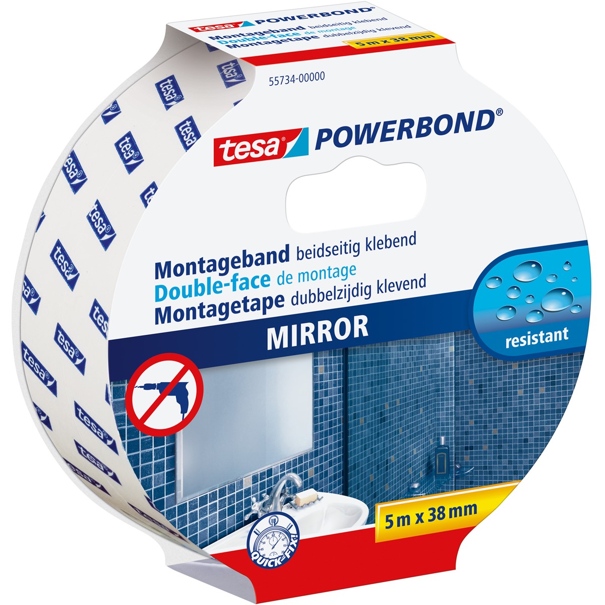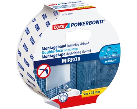 Stark klebendes tesa Powerbond® zur sicheren und schnellen Befestigung von Spiegeln und anderen flachen Objekten* in Feuchträumen.