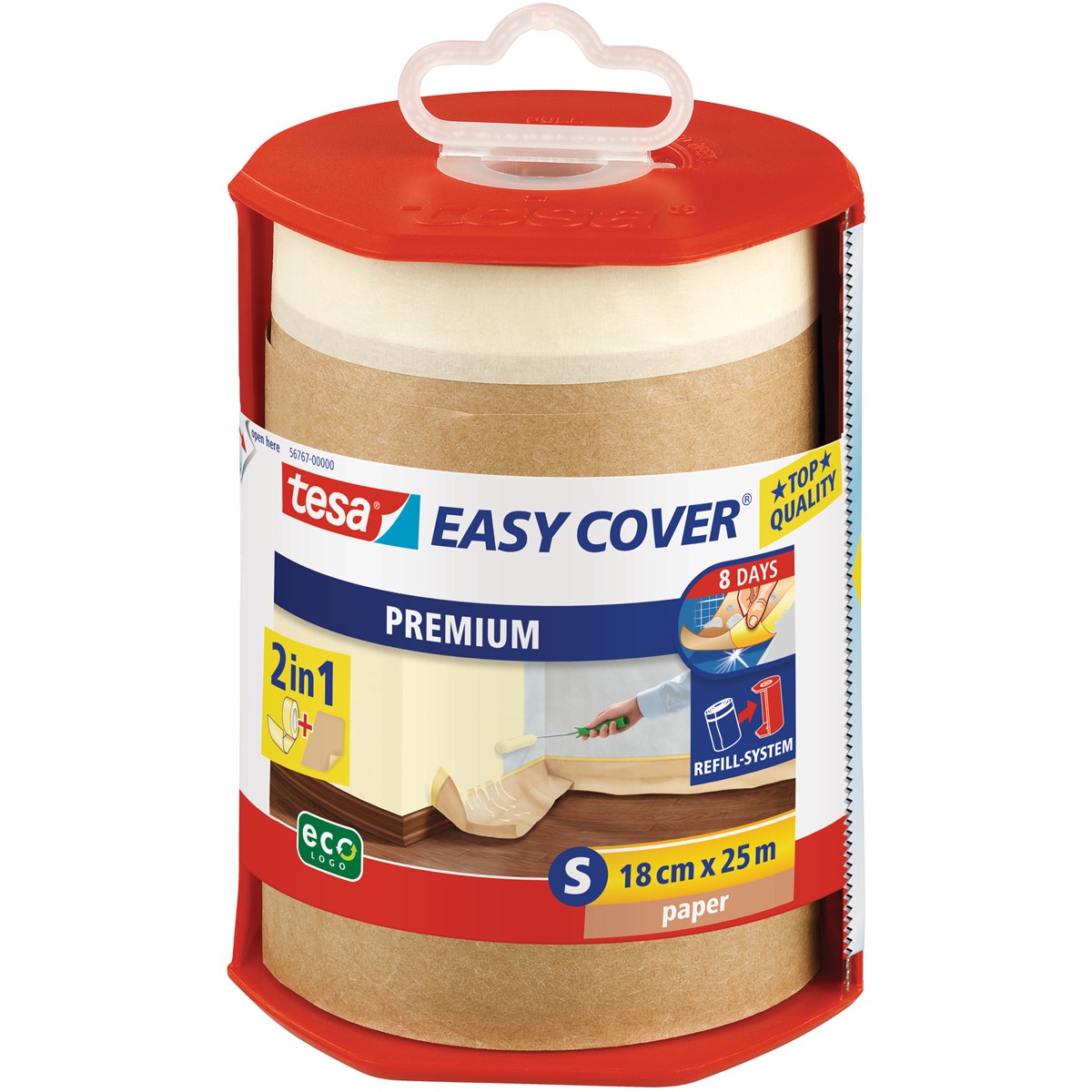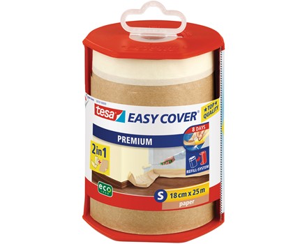 Das praktische ”2-in-1 Produkt“ tesa Easy Cover® Premium ist eine Kombination aus bewährter tesa® Maler-Krepp-Qualität und Abdeckpapier.