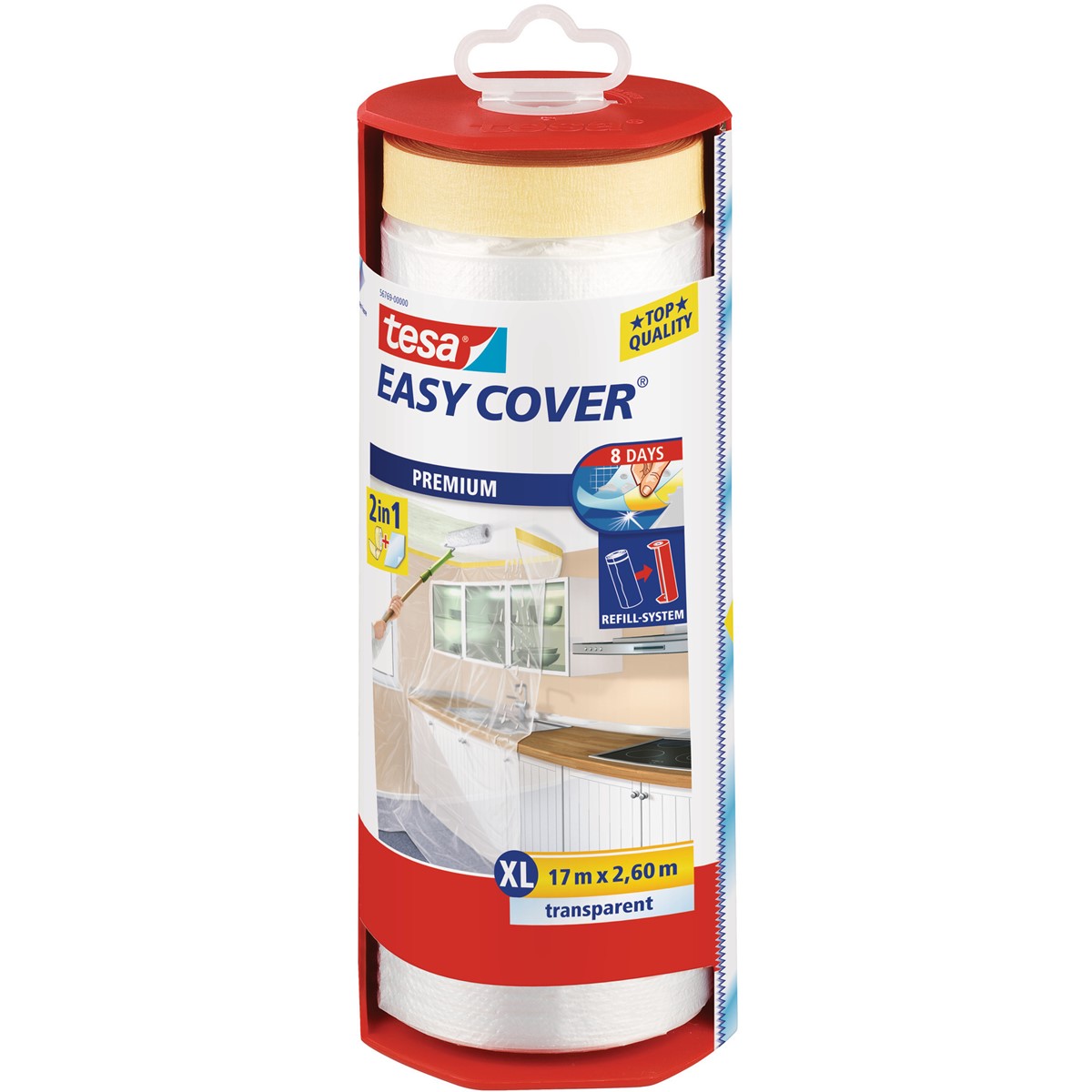 Das praktische ”2-in-1 Produkt“ tesa Easy Cover® Premium ist eine Kombination aus bewährter tesa® Maler-Krepp-Qualität und Abdeckfolie.
