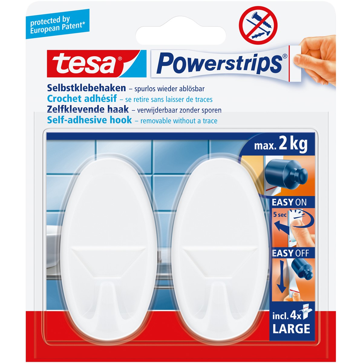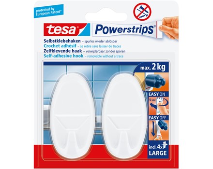 Die praktischen tesa Powerstrips® Haken LARGE haben eine starke Halteleistung bis zu 2 kg. Sie eignen sich so ideal zum Aufhängen von vielen Gegenständen in Küche, Bad und auf Reisen.