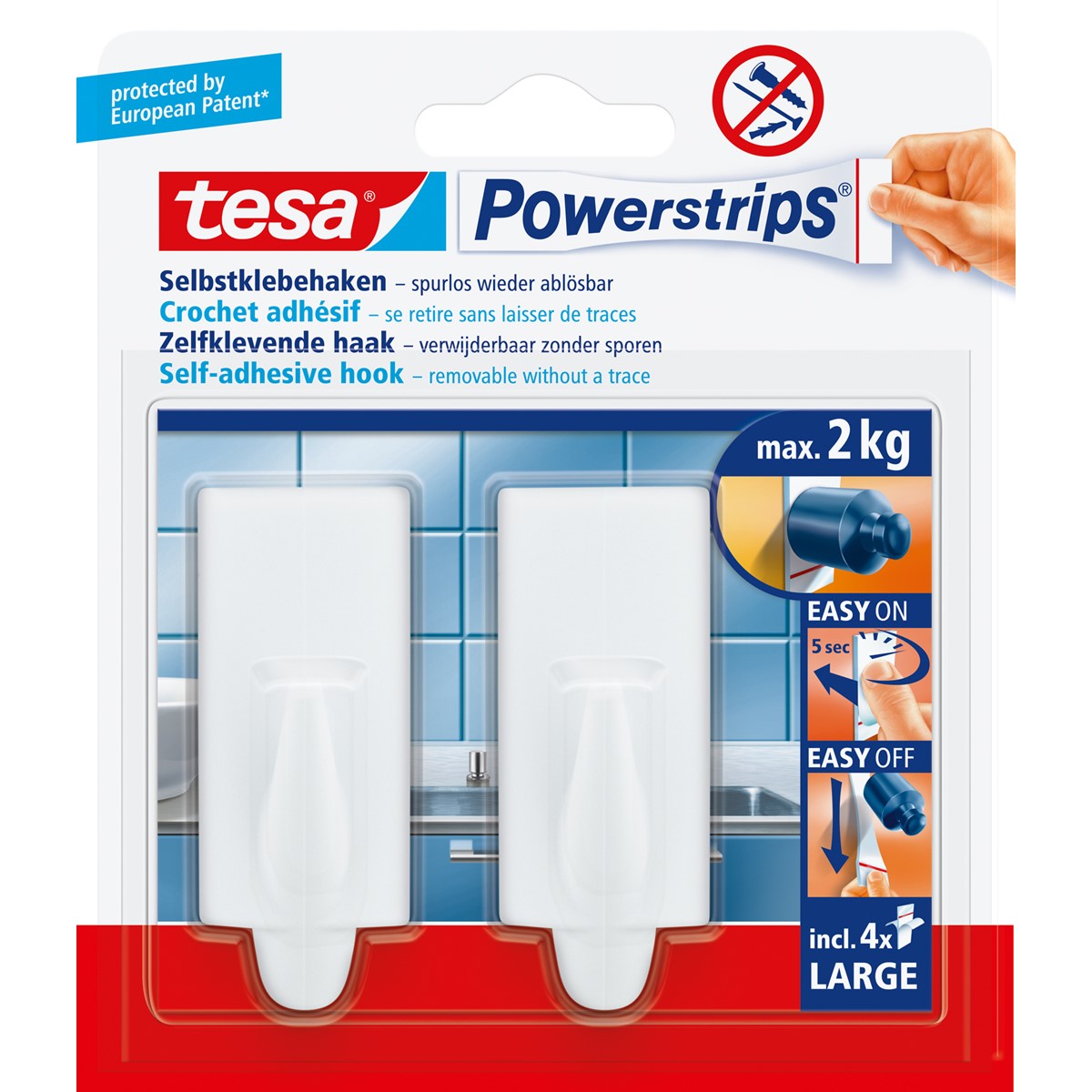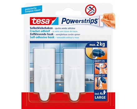 Die praktischen tesa Powerstrips® Haken LARGE haben eine starke Halteleistung bis zu 2 kg. Sie eignen sich so ideal zum Aufhängen von vielen Gegenständen in Küche, Bad und auf Reisen.