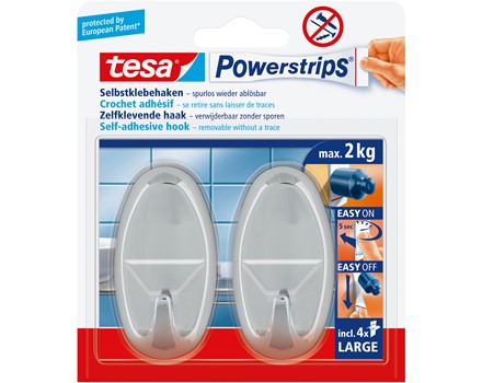 Die praktischen tesa Powerstrips® Haken LARGE haben eine starke Halteleistung bis zu 2 kg. Sie eignen sich so ideal zum Aufhängen von vielen Gegenständen in Küche, Bad und auf Reisen.