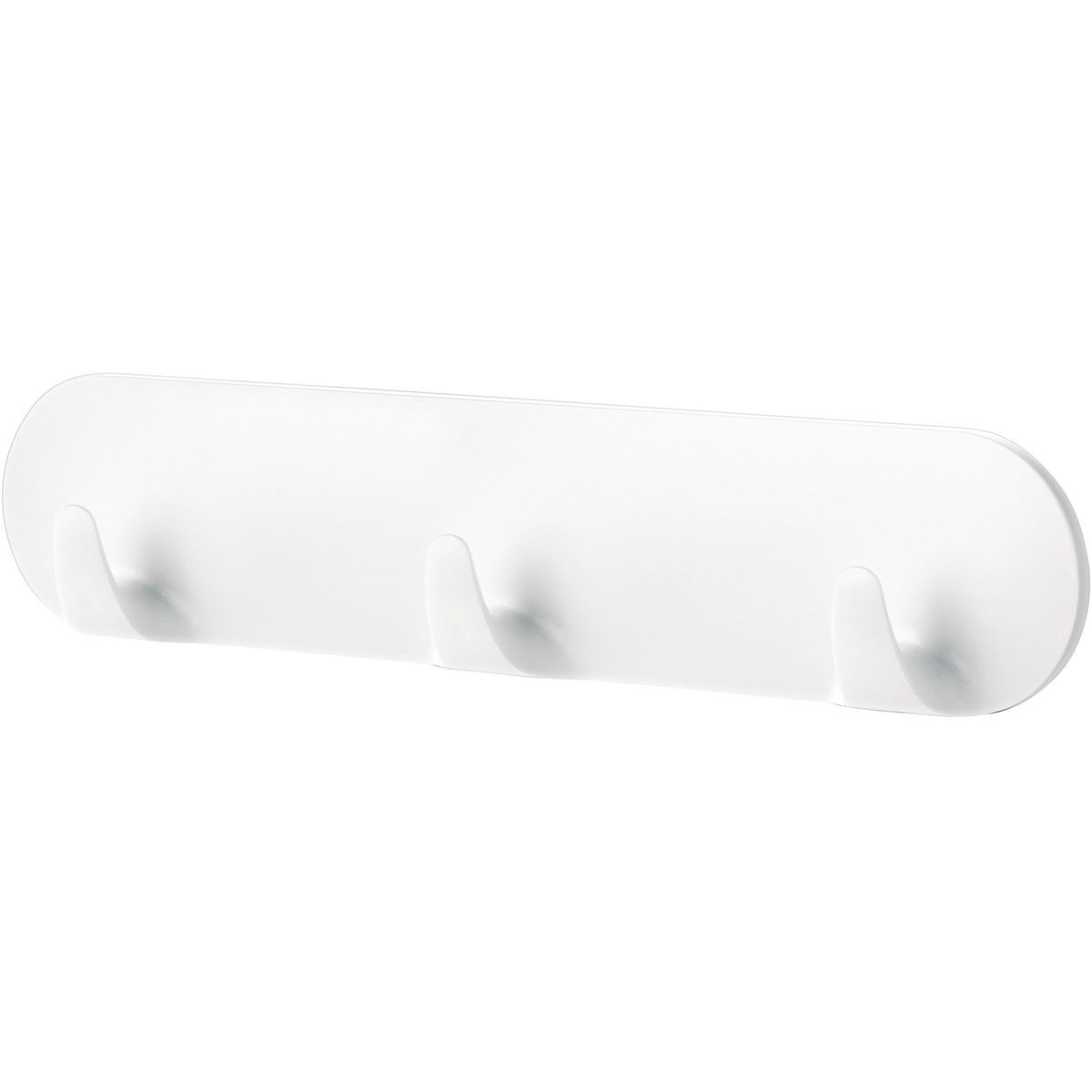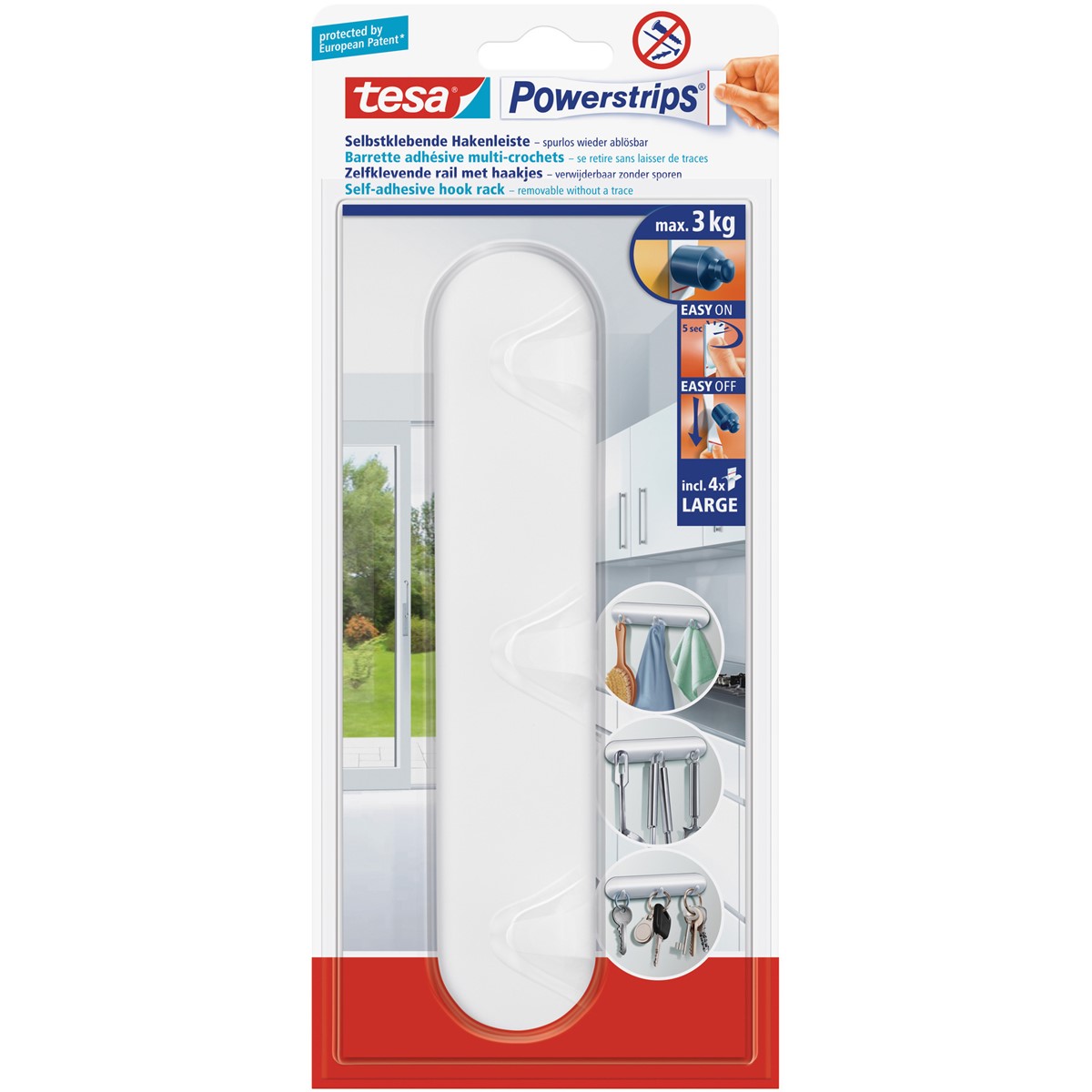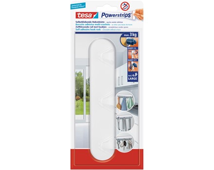 Mit der formschönen tesa Powerstrips® Hakenleiste lassen sich Utensilien aus Küche, Bad, Diele und Schränken gleich im Dreierpack an die Wand hängen.