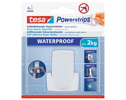 Die praktischen tesa Powerstrips® Waterproof Design-Haken Wave, Zahnbürsten- und Rasierhalter aus hochwertigem Kunststoff halten zuverlässig in feuchter Umgebung bis zu 2,0 kg Gewicht, der Duohaken sogar bis zu 3 kg. Sie eignen sich zum cleveren Anbringen von Gegenständen, die in der Dusche oder im Badezimmer gebraucht werden (z.B. Schwamm, Waschlappen, etc.) – ganz ohne Bohren, Schrauben oder Nägel.