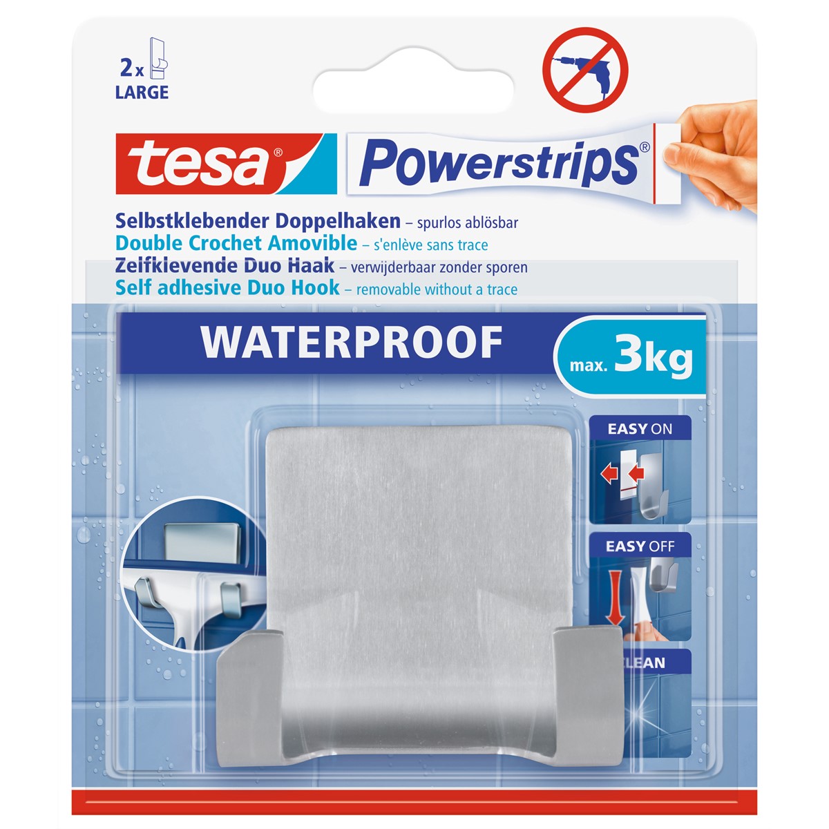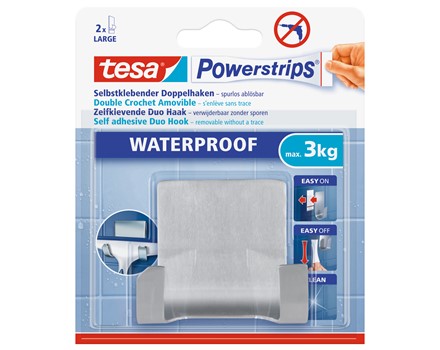 Die hochwertigen tesa Powerstrips® Waterproof Design-Haken Zoom, Zahnbürsten- und Rasierhalter aus Edelstahl halten zuverlässig in feuchter Umgebung bis zu 2,0 kg Gewicht, der Duohaken sogar bis zu 3 kg. Sie eignen sich zum cleveren Anbringen von Gegenständen, die in der Dusche oder im Badezimmer gebraucht werden (z.B. Schwamm, Waschlappen, etc.) – ganz ohne Bohren, Schrauben oder Nägel.