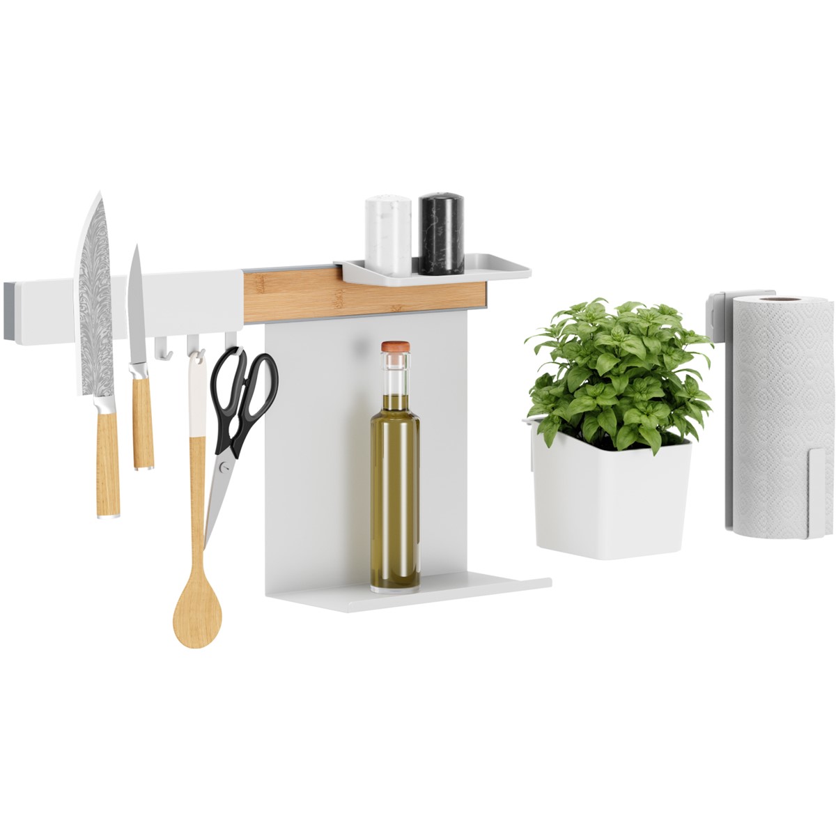 Inhalt: Küchenreling, Kräutertopf, 2 Adapter, 2 Ablagen, Messerleiste, 3 Haken, Rollenhalter und Halter für horizontale Anbringung