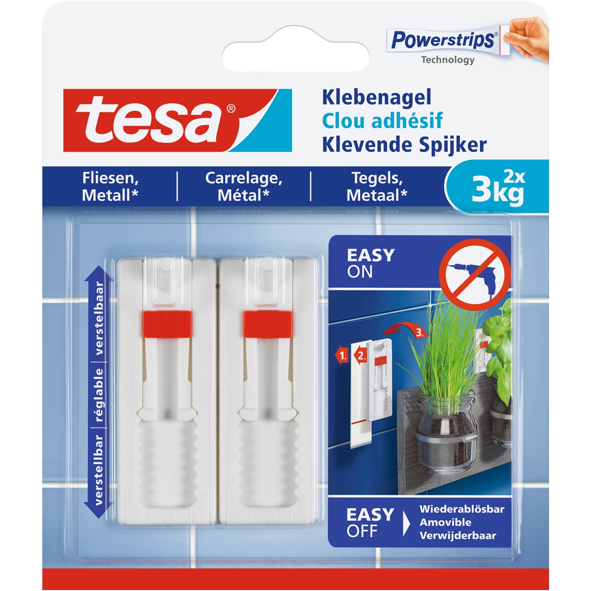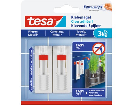 Der in der Höhe verstellbare Klebenagel verfügt auf glatten und festen Oberflächen über eine Haltekraft von bis zu 3kg. Wenn Sie zwei Klebenägel verwenden, können Sie sogar problemlos Objekte bis zu 6kg aufhängen. Sie können den Bohrer oder Hammer im Schrank lassen und benötigen nur die innovative Klebelösung von tesa®, um Objekte sicher anzubringen. Außerdem vermeiden Sie Schäden am Untergrund.