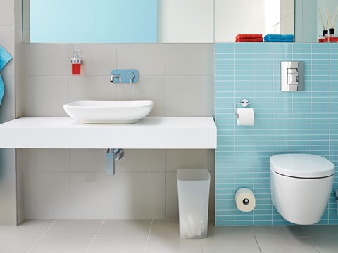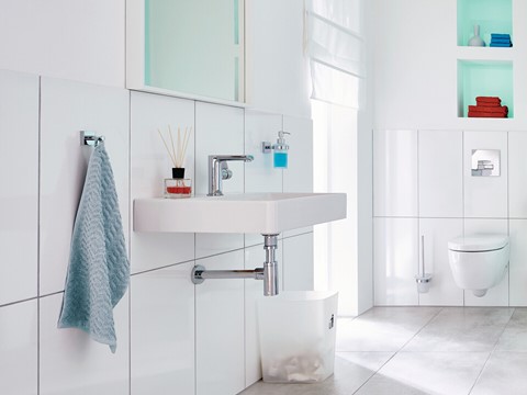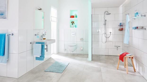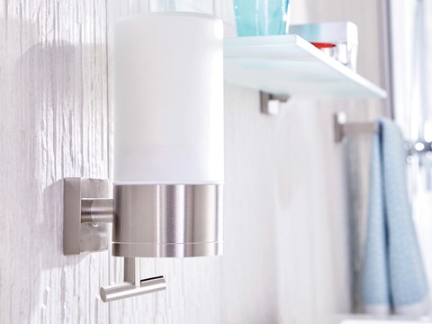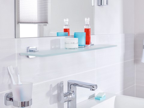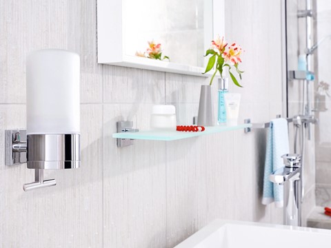 tesa Bad-Design ELEGAANT Kleben statt Bohren Halter, Haken, Seifen-Spender, Eimer, Körbe, Stangen, WC-BürstenVerchromtes Metall / mattiertes Weißglasrostfreieckige Formeninkl. Klebelösung