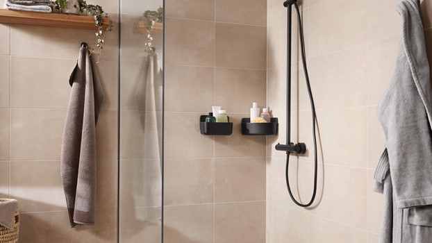 Die Serie LAVAA, bestehend aus vier schwarzen Duschkörben nutzt die Powerstrips Technologie und bietet Ordnung ohne Bohren in der Dusche.