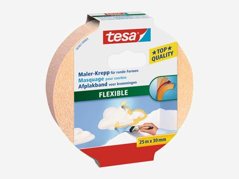 Das besonders stark gekreppte tesa Maler-Krepp Flexible zum exakten Abdecken von Kurven und Rundungen auf glatten und rauen Untergründen im Innenbereich.